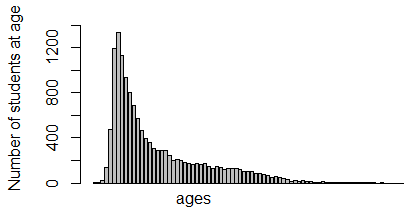 Following on with our example, after some work on my part, I can tell you that for a particular semester we had 35,856 registrations for credit courses generated by 13,856 different students. That does not tell you much about the data. However, I can also tell you that, although 71 of these students did not have a recorded birthdate, the remaining 13,785 students had an average age of 28.67 and a median age of 24. Those values, the mean and the median, are measures of central tendency. They give us a feel for the middle of the data. In particular, we now know that half the students are 24 or younger and half are 24 or older. Also, since the average age is higher than is the median age, we get the sense that there must be some "really old" students to pull up that average age.