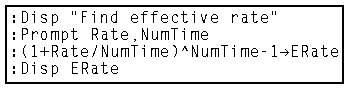 The following programs have been developed to compute Effective Rates on the TI-85, TI-86, and TI-89 calculators.