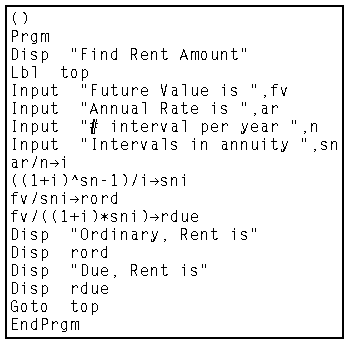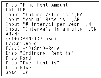 The following programs have been developed to compute the Rent Amount for annuities on the TI-85, TI-86, and TI-89 calculators.