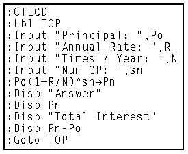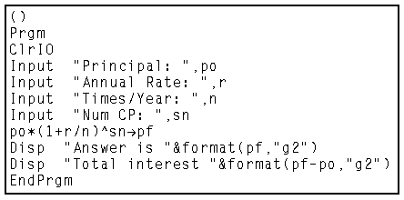 The following programs have been developed to compute compound interest on the TI-85, TI-86, and TI-89 calculators.
