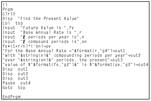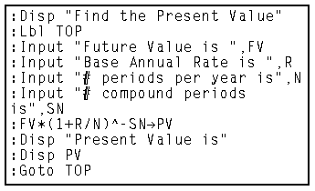 The following programs have been developed to compute Present Values on the TI-85, TI-86, and TI-89 calculators.