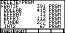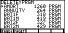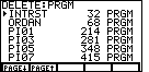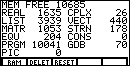 This will display a version of Figure 2. Note that the values in Figure 2 are from a particular calculator at a particular time; they will be different from the values on your calculator screen. In Figure 2 we see, for example, that we have 10,685 free cells, that we have used 3939 cells to store LISTs, and that we have used 10,041 cells to store programs. The 10,685 free cells are quite enough for us. However, let us take this opportunity to examine and possibly remove an old program to create more open space. |