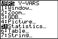 To do this we first move to the VARS menu. Then we move to the Statistics... option. |
