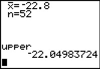 Knowing the population standard deviation means that we can use the normal distribution tables. We know that the standard devaition of the sample means will be approximately `sigma/sqrt(n) = 2.76/sqrt(52)`. We calculate this value and store it in `X`. We also know, or we could look up or compute, that the z-score corresponding to `95%` is `1.96`. Therefore, our confidnece interval will be the interval from `barx-1.96*2.76/sqrt(52)` to `barx+1.96*2.76/sqrt(52)`. On the calculator we compute these values as –22.8–1.96*X and –22.8+1.96*X |