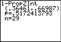 To do this problem the long way we first compute the standard deviation of the sample proportions. 15/29 is the proportion of characteristic S in our sample. `sqrt((P*(1-P))/29)` is the standard deviation of the sample proportions. Such sample proportions are normally distributed. Therefore, for a 90% confidence interval we use the z-score of 1.645. Our lower end of the confidence interval will be .3645977959. |