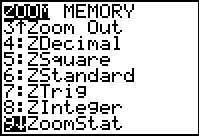 We have jumped to the ZZOOM menu because we want to use the ZoomStat option. We want to use this option because it will set the WINDOW values according to the data that is in our list. However, as you can see, ZoomStat is not displayed on this screen. Instead we will need to use the cursor keys to move down the menu to find ZoomStat. | ||||||||||||||||||||||||||