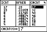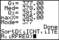 We could stop our calculator work here. After all, we have 10 rows of values and we could sort those rows by hand putting the row with 17 in LICNT at the top, followed by the row with 15 in LICNT, followed by the row with 8 in LICNT, and so on. Then we can construct, by hand, a Pareto chart by using the associated frequencies to determine the height of each bar on the chart. If we make the first bar, the one associated with the value 377, 10 centimeters tall, then the height of the bar representing 376, with 15 as its frequency will be determined by 15*(10/17). This calculation was presented and discussed in the material on bar charts. On the other hand, perhaps we can get the calculator to sort this information for us. |