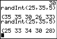 We then recalled the command and performed it again, this time generating the values {25 33 34 30 28}. We were lucky enough this time to not have any repeated values. |