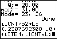 Now the program is done. One of the tasks that the program accomplihes behind the scenes is taht it creates some new lists, namely LITEM, LICNT, and LLINP, to hold, respectively, the different ITEMs found in the original list, the COUNT of the different items found in the original list, amd the values in the original list sorted into ascending order. COLLATE2 also modifies the STAT Editor to display these lists. | ||||||||||||||||||||||||||||||