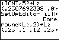 Were we asked to produce the table rounded to 2 decimal places, then we could do this by hand for each of the values in L2. On the other hand, we might as well let the calculator do this for us. | ||||||||||||||||||||||||||||||