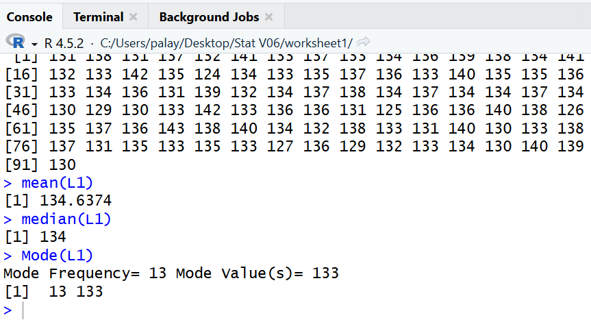 mean is 134.6374, the median is 134,