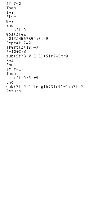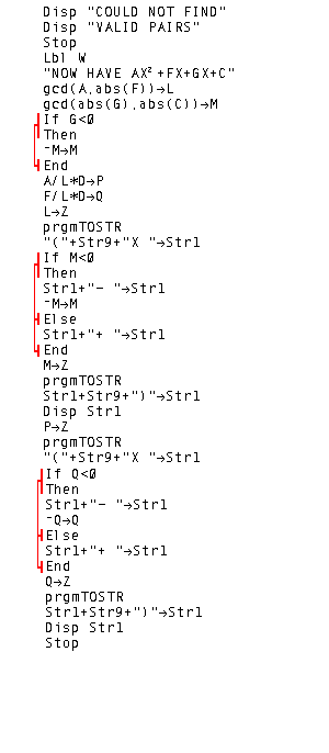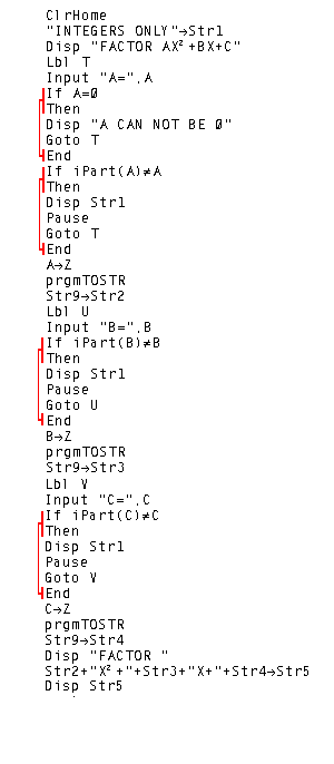 Naturally, one could enter the programs into a calculator. However, the TI-83 file for TRIFACT2 in is available at trifact2.83p and the TI-83 file for TOSTR at tostr.83p. Similar files are available for the trifact2 program on the TI-85, the tostr program on the TI-85, the trifact2 program on the TI-86, and the tostr program on the TI-86 Depending upon your browser, you should be able to save the file to your disk and then transfer it via TI-Graphlink, assuming you have the program and the required cable.